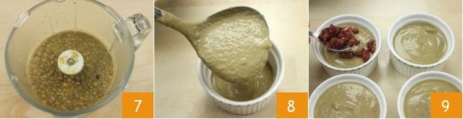 Une fois cuites, mixez les lentilles dans un mixeur jusqu'à obtenir une crème fine 7. Si elle vous semble trop épaisse, ajoutez du bouillon de légumes. Versez-la dans 4 petites cocottes 8 et ajoutez dans chacune le cotechino émietté 9.