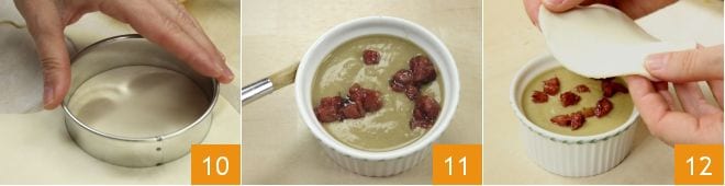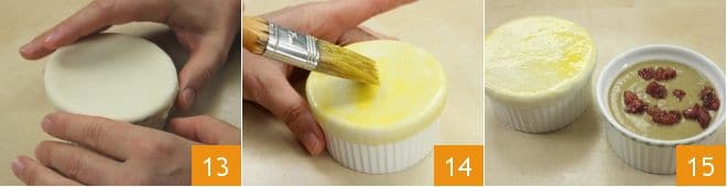 Découpez avec un emporte-pièce des cercles de pâte feuilletée d'un diamètre de 1 cm plus large que celui des cocottes 10. Humidifiez le bord des cocottes avec de l'eau et recouvrez-les avec le cercle de pâte feuilletée 12,