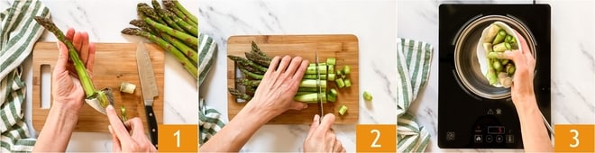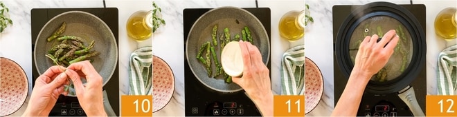 Dans une poêle antiadhésive, versez un filet d'huile, ajoutez les asperges, une pincée de sel et quelques feuilles de marjolaine 10. Ajoutez 2-3 cuillères à soupe d'eau 11, couvrez avec un couvercle 12 et faites cuire pendant 3 minutes. Elles doivent rester croquantes.