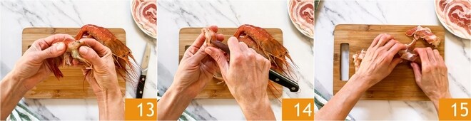 Nettoyez les crevettes en retirant la carapace 13 et le filament noir 14. Enroulez une demi-tranche de pancetta autour de chaque crevette 15 et préparez ainsi les autres.