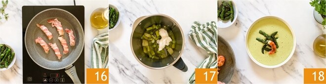 Faites cuire les crevettes à la poêle 16, en les retournant de tous les côtés pendant un total de 3 minutes, jusqu'à ce qu'elles soient croustillantes. Versez ensuite dans un mixeur les asperges et les pommes de terre, ajoutez la crème aigre 17 et mixez le tout, jusqu'à obtenir une crème. Si elle devait être trop épaisse, ajoutez 1-2 cuillères à soupe d'eau tiède. Transférez la velouté dans les assiettes, décorez avec les pointes d'asperges et les crevettes 18. Ajoutez une pincée de poivre, un filet d'huile crue et les graines de sésame.