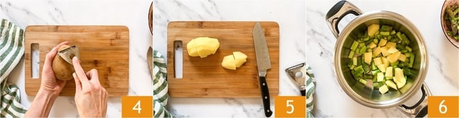 Épluchez la pomme de terre 4 et coupez-la en morceaux, de quelques centimètres 5. Dans une casserole, ajoutez les rondelles d'asperges (mais pas les pointes) et les pommes de terre 6.