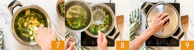 Ajoutez un filet d'huile 7, une pincée de sel et laissez dorer quelques minutes. Puis ajoutez le bouillon fait avec la base des asperges, en le filtrant 8. Couvrez avec un couvercle 9 et laissez cuire pendant 20 minutes à feu modéré.