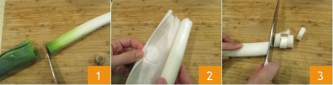 Pour préparer le velouté de céleri-rave, commencez par nettoyer les légumes : rincez les poireaux sous l'eau courante, éliminez la partie verte 1 et la partie avec la racine qui se trouve à l'extrémité opposée, puis pratiquez une incision longitudinale avec le couteau et retirez les feuilles extérieures les plus coriaces 2; enfin, coupez la tige du poireau en morceaux d'environ 2 cm d'épaisseur 3. Vous devez obtenir environ 280 g de poireau nettoyé.