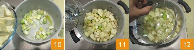 et de céleri-rave 10, augmentez le feu et faites-les griller pendant 5 minutes supplémentaires, puis versez l'eau froide 11, couvrez avec un couvercle 12 et laissez cuire à feu moyen pendant environ 40 minutes.