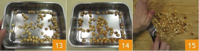 Entre-temps, disposez les noisettes pelées dans un plat allant au four 13 et faites-les griller dans un four ventilé préchauffé à 190° pour environ 15 minutes ou jusqu'à ce qu'elles soient dorées 14; une fois grillées, cassez grossièrement les noisettes en les écrasant avec la partie plate de la lame d'un couteau 15.