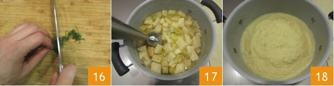 Enfin, hachez finement les feuilles de sauge que vous aviez mises de côté 16. Une fois le temps de cuisson des légumes écoulé, éteignez le feu et mixez le tout avec un mixeur plongeant 17 jusqu'à obtenir un mélange crémeux 18.