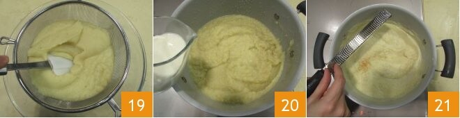 Versez la crème dans une passoire et tamisez-la à l'aide d'une spatule, pour obtenir une consistance veloutée 19. Ajoutez la crème fraîche liquide 20 et la noix de muscade râpée 21 et mélangez bien.