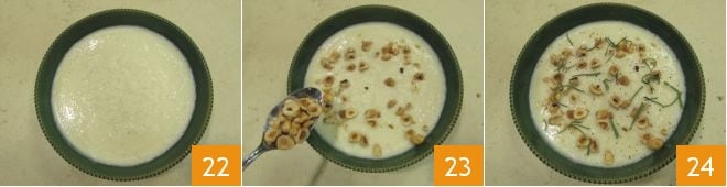 Vous pouvez maintenant transférer le velouté dans une assiette creuse 22, garnir la surface avec les noisettes grillées 23, ajouter un peu de sauge hachée et un tour de moulin à poivre : votre délicieux velouté de céleri-rave est prêt à être dégusté 24 !