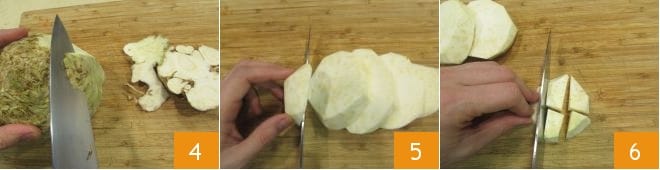 Passez maintenant au céleri-rave : lavez-le soigneusement sous l'eau courante pour enlever les résidus de terre, puis retirez la peau avec la lame aiguisée d'un couteau 4 et coupez-le d'abord en tranches 5 puis en morceaux d'environ 2 cm d'épaisseur 6. Vous devez obtenir environ 1,2 kg de céleri-rave nettoyé.