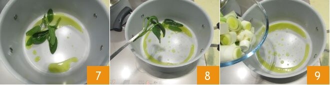 Chauffez l'huile dans une casserole, ajoutez les feuilles de sauge (gardez quelques feuilles pour la garniture finale) et laissez-les parfumer l'huile pendant environ 5 minutes à feu moyen-doux 7, puis retirez-les avec une pince de cuisine 8. À ce stade, ajoutez les morceaux de poireau 9