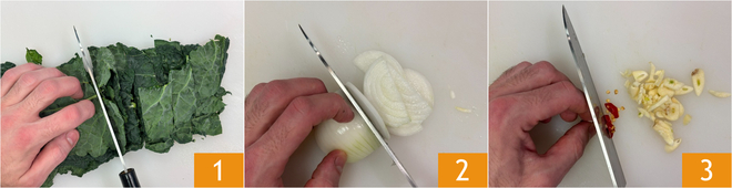 Pour réaliser le velouté de chou noir et haricots, commencez par préparer le bouillon de légumes et gardez-le au chaud. Nettoyez le chou noir et coupez 300 g de feuilles en fines lanières 1. Épluchez et émincez finement l'oignon 2, puis faites de même avec l'ail et le piment 3.