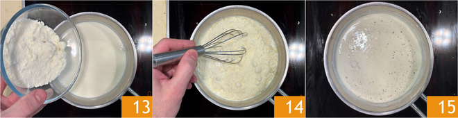 Une fois chaude, éteignez le feu et ajoutez le pecorino râpé 13. Mélangez bien avec un fouet pour dissoudre complètement le fromage 14 et obtenir une consistance lisse et crémeuse 15.