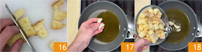 Passez aux croûtons : coupez le pain en cubes 16. Dans une poêle, faites infuser un filet d'huile avec les gousses d'ail 17, puis ajoutez les cubes de pain 18.
