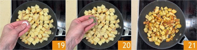 Assaisonnez avec du sel 19 et du romarin haché 20 et faites-les griller à feu moyen jusqu'à ce qu'ils soient dorés et croquants 21.