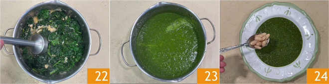 Une fois le temps de cuisson de la soupe écoulé, mixez avec un mixeur plongeant 22 pour obtenir une consistance lisse et veloutée 23. Si elle est trop épaisse, vous pouvez l'allonger avec un peu de bouillon ; sinon, vous pouvez la laisser réduire légèrement sur le feu. Servez le velouté et garnissez avec les haricots mis de côté, que vous aurez assaisonnés avec un filet d'huile 24.
