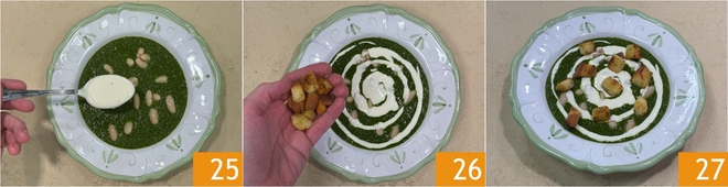 Complétez avec la fondue de pecorino 25 et les croûtons de pain croquants 26. Votre velouté de chou noir et haricots est prêt à être servi 27 !