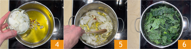 Dans une grande casserole, chauffez l'huile avec l'ail, le piment et l'oignon 4 et laissez revenir environ 5 minutes 5. Lorsque l'oignon est ramolli, ajoutez le chou noir 6 et faites cuire encore 5 minutes à feu moyen, en remuant souvent.