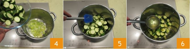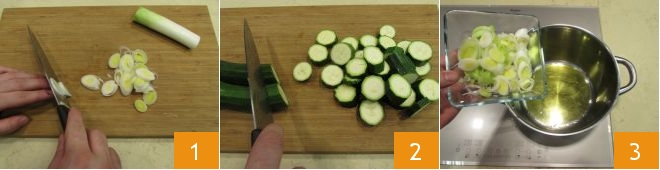 Pour préparer le velouté de courgettes, commencez par réaliser le bouillon de légumes. Une fois prêt, occupez-vous du poireau : éliminez les extrémités, en ne gardant que la partie centrale, épluchez-le en éliminant la première couche et coupez-le finement 1. À ce point, lavez et équeutez les courgettes, puis coupez-les en rondelles 2. Versez l'huile dans une casserole, laissez-la chauffer et ajoutez les poireaux 3;