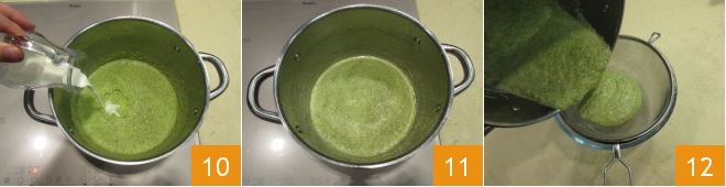 Ajoutez la crème fraîche 10, mélangez et faites cuire encore pendant une dizaine de minutes 11, puis versez votre velouté de courgettes dans un tamis 12