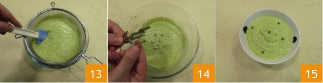 et tamisez-le pour obtenir une consistance lisse 13. Ajoutez les petites feuilles de thym pour aromatiser 14, dressez et servez votre velouté de courgettes 15 !