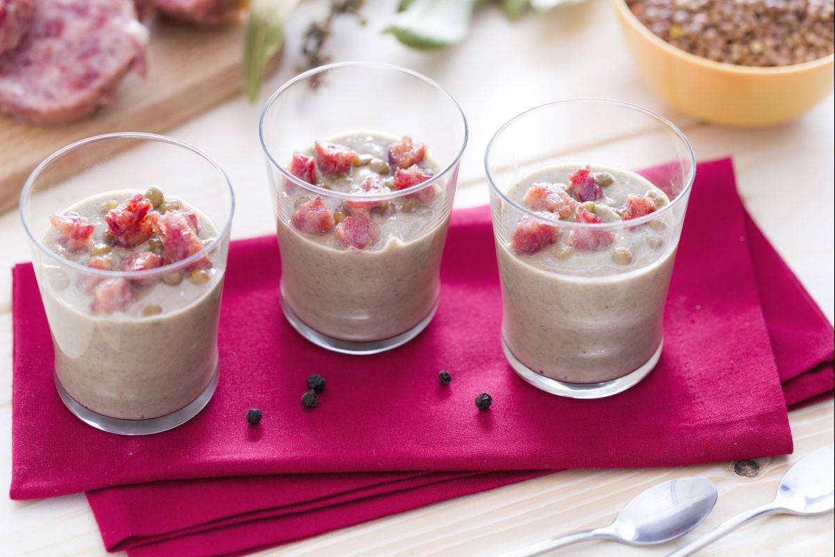 Le velouté de lentilles aux dés de cotechino croustillant est une idée sympa et originale pour surprendre vos invités en proposant une façon inhabituelle de déguster le Cotechino avec des lentilles le jour du Nouvel An, en recyclant éventuellement les ingrédients restants de la veille.