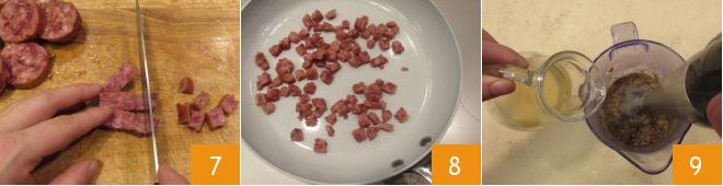 Quand les lentilles seront presque cuites, passez au cotechino. Retirez la peau et coupez-le en dés de 3-4 mm 7. Faites ensuite sauter le cotechino à la poêle, sans ajouter d'huile, pendant 5-6 minutes, jusqu'à ce qu'il devienne croustillant 8. Puis maintenez-le au chaud et occupez-vous du velouté. Transférez les lentilles cuites dans un bol à bords hauts en en réservant une cuillerée. Mixez avec un mixeur plongeant, en ajoutant petit à petit le bouillon que vous aviez conservé 9.