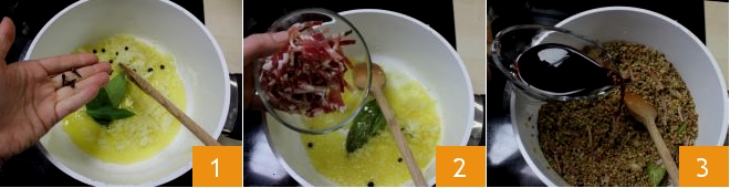 Pour préparer le velouté de lentilles au cotechino croustillant, commencez par cuire les légumineuses. Faites revenir dans une casserole antiadhésive, à feu doux, l'oignon finement haché avec l'huile, puis ajoutez les feuilles de laurier, les baies de genièvre et les clous de girofle 1. Coupez finement la pancetta fumée en lardons et ajoutez-les à l'oignon 2. Incorporez les lentilles sèches et laissez-les s'imprégner du condiment pendant quelques instants, puis déglacez avec le vin rouge 3.