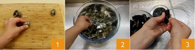 Pour préparer le sauté de moules et palourdes, commencez par purger les palourdes : éliminez celles avec la coquille cassée en les tapant une par une sur une planche à découper du côté de l'ouverture 1. Si du sable noir sort, cela signifie que la palourde est pleine de sable et doit donc être jetée. Ensuite, placez les palourdes dans une passoire posée sur un bol et rincez-les plusieurs fois sous l'eau courante 2 : arrêtez lorsque le bol ne montre plus de sable. Lavez également les moules, retirez le byssus, la petite barbe qui dépasse de la coquille 3 et grattez la coquille avec un tampon à récurer pour enlever les impuretés.