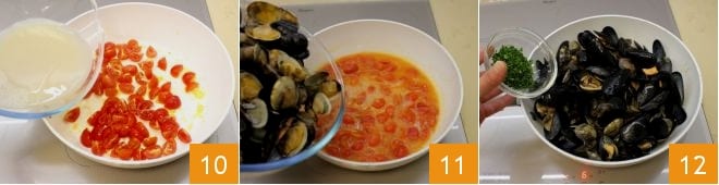 Laissez cuire les tomates cerises quelques minutes en remuant. Ensuite, versez le liquide de cuisson des mollusques 10 et laissez cuire environ 5 minutes pour le faire réduire. Versez ensuite les moules et les palourdes 11, faites cuire encore 2-3 minutes, éteignez le feu et aromatisez avec du persil haché 12.