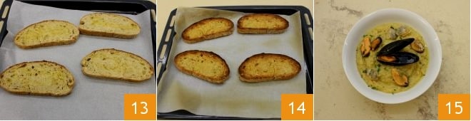 Pour accompagner le plat, vous pouvez griller au four des tranches de pain de campagne : arrosez des tranches de pain, placez-les sur une plaque recouverte de papier sulfurisé et faites-les chauffer des deux côtés dans un four statique préchauffé à 220° pendant environ 10 minutes (si four ventilé à 180° pendant 5 minutes) (13-14). Maintenant que tous les ingrédients sont prêts, versez dans les bols de service le velouté de pois chiches et par-dessus le sauté de moules et palourdes, certaines décoquillées d'autres entières 15. Servez le velouté de pois chiches avec sauté de moules et palourdes avec les croûtons de pain !