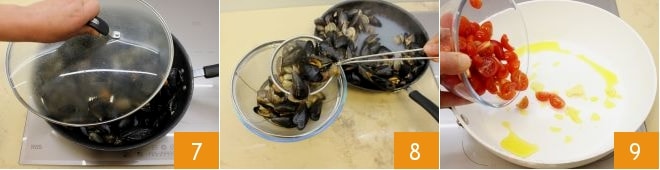 Couvrez avec un couvercle et laissez-les s'ouvrir 7 : cela prendra très peu de temps. Dès que les moules et les palourdes sont ouvertes, égouttez-les et gardez-les au chaud 8 ; conservez également dans un petit bol le liquide qu'ont libéré les mollusques en s'ouvrant. Dans une grande poêle, versez l'huile, l'ail écrasé et les tomates cerises 9.