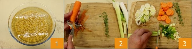Pour préparer le velouté de pois chiches, il faudra veiller à faire tremper les pois chiches secs pendant au moins 12 heures (vous pouvez le faire la veille au soir). Ensuite, préparez les autres légumes : épluchez la carotte 2, préparez le céleri, le poireau et le thym. Tranchez tous les légumes 3 et prenez les feuilles des branches de thym.