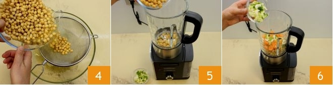 Égouttez les pois chiches 4 de l'eau de trempage. Puis, versez de l'eau dans le mixeur vapeur jusqu'à sa capacité maximale, et dans le bol, versez les pois chiches 5, le poireau, les carottes et le céleri 6.