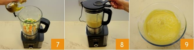 Salez et poivrez à votre goût, versez l'huile d'olive 7 et fermez le bol avec le couvercle approprié pour mixer tous les légumes 8. Réglez la cuisson pendant une demi-heure, en ajoutant de l'eau jusqu'à atteindre 1,5 lt. Une fois cuit et mixé, votre velouté de pois chiches est prêt, vous pouvez le conserver au chaud jusqu'au moment de l'utiliser 9.