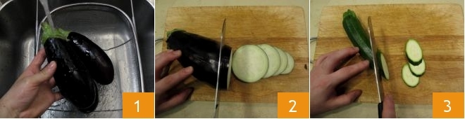 Pour préparer les légumes grillés, lavez tous les légumes sous un abondant filet d'eau fraîche 1 et séchez-les. Coupez les courgettes et les aubergines en rondelles d'une épaisseur de 4-5 mm (2-3);