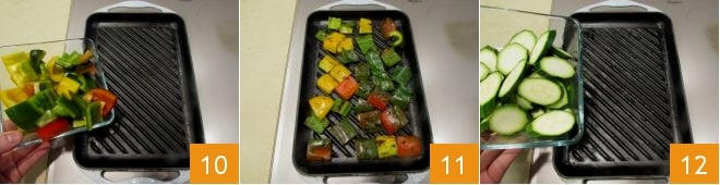 Lorsque la grille est bien chaude, faites cuire les légumes peu à peu : disposez les poivrons les uns à côté des autres 10, en les grillant pendant 5 minutes et en les retournant avec une pince de cuisine pour une cuisson uniforme 11, puis mettez les courgettes sur le feu 12