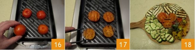 Enfin, terminez avec les tomates, en les cuisant pendant 4 minutes jusqu'à ce qu'elles soient bien grillées (16-17). Enfin, vous pouvez servir vos légumes grillés, en les assaisonnant avec de l'huile d'olive, du sel et du poivre 18.