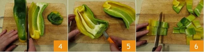 prenez les poivrons, éliminez la partie supérieure, divisez-les en deux 4, puis avec un couteau, enlevez les filaments blancs et les graines à l'intérieur 5. Coupez-les en tranches, puis en gros cubes et réservez 6.