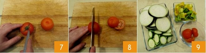Enlevez le pédoncule des tomates 7 et coupez-les en rondelles toujours de 4-5 mm 8. Une fois tous les légumes coupés 9, mettez à chauffer une grille sur le feu.