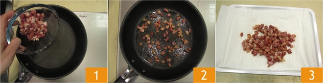 Pour réaliser les verrines de melon et lard, commencez par chauffer une poêle antiadhésive, versez le lard 1 et laissez-le dorer 2. Transférez le lard sur un plateau recouvert de papier absorbant 3 pour éliminer l'excès de graisse.