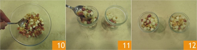 Mélangez le tout pour assaisonner 10, puis remplissez des verrines mignonnes d'apéritif 11 et servez 12.