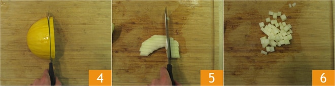 Entre-temps, occupez-vous du melon : coupez-le en deux, enlevez les graines à l'intérieur puis coupez-le en tranches 4. Retirez la peau et coupez ensuite les tranches d'abord horizontalement puis verticalement 5, de façon à obtenir des cubes d'environ 1 cm 6.