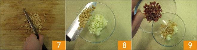 Hachez grossièrement les arachides avec un couteau 7. Dans un grand bol, versez le melon, les arachides 8 et le lard 9.