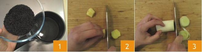 Pour préparer les verrines de riz vénéré et espadon, commencez par verser le riz dans une grande quantité d'eau salée 1 et faites-le cuire pendant environ 40 minutes. Pendant ce temps, épluchez le gingembre et coupez-le en gros morceaux 2, puis nettoyez le poireau et coupez-le en rondelles 3.