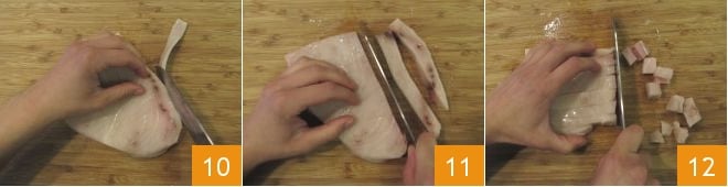 Maintenant, passez à la préparation du tronçon d'espadon : enlevez la peau 10 et coupez-le d'abord en lanières 11 puis en dés 12.