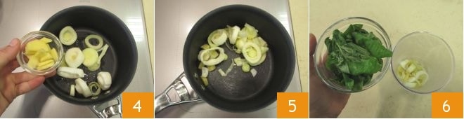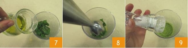 Faites chauffer un filet d'huile dans une petite casserole et faites revenir le poireau et le gingembre pendant quelques minutes (4-5). Transférez le mélange dans un récipient haut et étroit, ajoutez les feuilles de basilic que vous aurez préalablement lavées et séchées 6