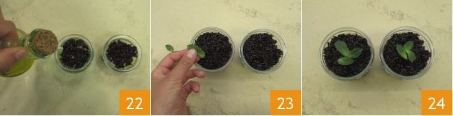Enfin, garnissez avec un filet d'huile sur le dessus 22 et quelques feuilles de menthe fraîche 23 : vos verrines de riz vénéré et espadon sont prêtes à être servies tièdes ou à température ambiante 24 !