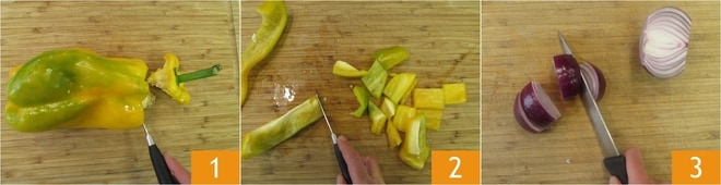 Pour réaliser les verzini au bbq avec poivrons et oignons, commencez par laver les poivrons, retirez le chapeau et les graines internes 1, puis réduisez-les en morceaux d'environ 2 cm 2. Nettoyez et coupez également les oignons rouges en morceaux de 2 cm 3.