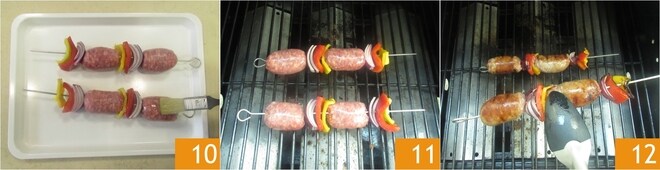 Badigeonnez les brochettes avec de l'huile d'olive 10. Chauffez le bbq, qui devra atteindre une température d'environ 250°. Disposez les brochettes 11, faites cuire pendant 18 minutes en prenant soin de les retourner toutes les 4 minutes environ, afin de les dorer uniformément 12.